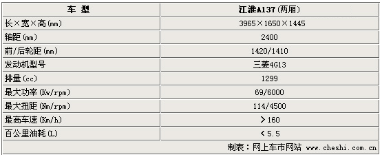 江淮A137采用三菱4G13发动机,排量为1.3L,最大功率达到了69Kw,最高车速超过160km/h,排放为欧IV标准,百公里油耗小于5.5升。虽然目前还没有配置方面的具体资料,但从目前掌握的信息来看,除了目前同级别车型的基本配置外,还配有双安全气囊、外开式电动天窗、中央遥控门锁、带调频功能单碟CD、倒车雷达系统、车载电源接口等。
