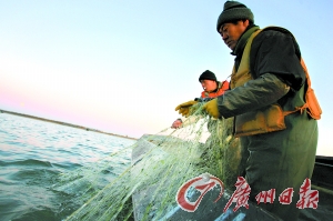 昨日,抚远渔民索亚军、张志忠和池洪生在乌苏里江拉网捕捞大马哈鱼。抚远县是中国的“大马哈鱼之乡”。 骆昌威 摄