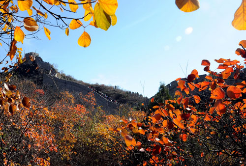 从9月下旬开始,红枫、八角枫、黄栌的叶子开始变成红色,本周霜降过后,随即进入红叶最佳观赏期,长城两侧的山峦由绿、红、黄相间的多彩颜色逐渐变成漫山红遍的壮丽色彩。因景区树木品种繁多,树龄长短不同,八达岭红叶观赏期可持续到11月中旬。