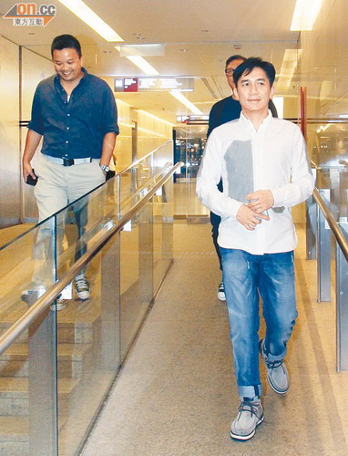 面红红的梁朝伟带头离开,麦兆辉(微博)(左)与庄文强尾随。
