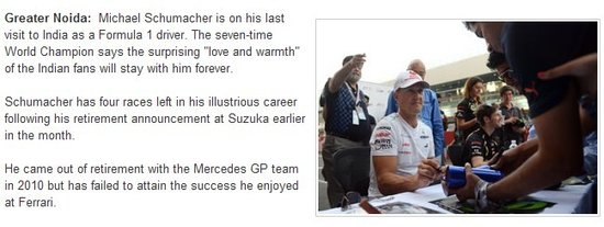 奔驰车手舒马赫感谢印度车迷的热情,但是他表示自己不会再回到印度了,至少不是作为一位F1车手,这位七冠王表示不会考虑第二次复出了。不论他未来的计划如何,这里的车迷仍然对他倾注了极大的崇拜和热情。
