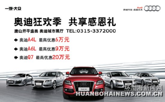 唐山开平盛奥2012年11月携奥迪全系感恩回馈新老客户,2012年11月17日诚邀您莅临唐山盛奥奥迪城市展厅,特惠车型集体献礼,现车供应,颜色齐全,价格风暴冲破底线:奥迪A4L最高优惠6万元,老款奥迪A6L最高优惠9万元,奥迪Q7最高优惠20万……活动当天购车即可参与千元抽奖,中奖率100%。奥迪全系各型号强大产品阵容诚邀试驾品鉴,同期开展金融贷款、二手车置换等各项购车专案,成功置换另享万元感恩礼包。