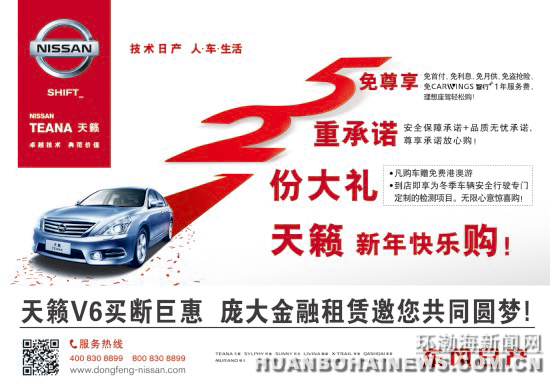 天籁V6买断巨惠,庞大集团携带融资租赁、N延保等精彩呈现,邀您共同圆梦,东风日产冀东专营店岁末大酬宾,为答谢新老客户,同时吸引更多的客户加入我们东风日产大家庭,庞大集团独家买断天籁车型,价格优惠堪称前所未有,数量有限,先到先得,希望广大车主朋友莫失良机,把握机会!即日起购买天籁可享受折上折,同时购东风日产任意一款车均可参加唐山冀东专营店了“礼砸金蛋”活动。您将以最实惠的价格,收获最时尚的靓车,一定会让您满载而归。您还在等什么?赶快拿起电话订购吧!抢车预约专线:0315-2960003
