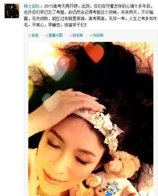 大S也在同一天告诫考生们心情要放轻松,称:“另外明天就是高考了,同学们要放松心情才能发挥的更好喔!(紧张会导致手抖、思绪混乱、焦虑、情绪不稳定等等)好啦不吓唬你们了!无论考生心情如何,都祝福你们有美好的未来!加油!”