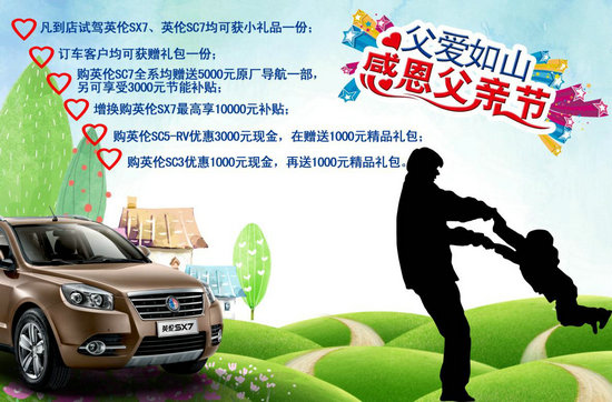 ²活动期间,购英伦SC7全系均赠送5000元原厂导航一部,另可享受3000元节能补贴;增换购英伦SX7最高享10000元补贴;购英伦SC5-RV优惠3000元现金,在赠送1000元精品礼包;购英伦SC3优惠1000元现金,再送1000元精品礼包。